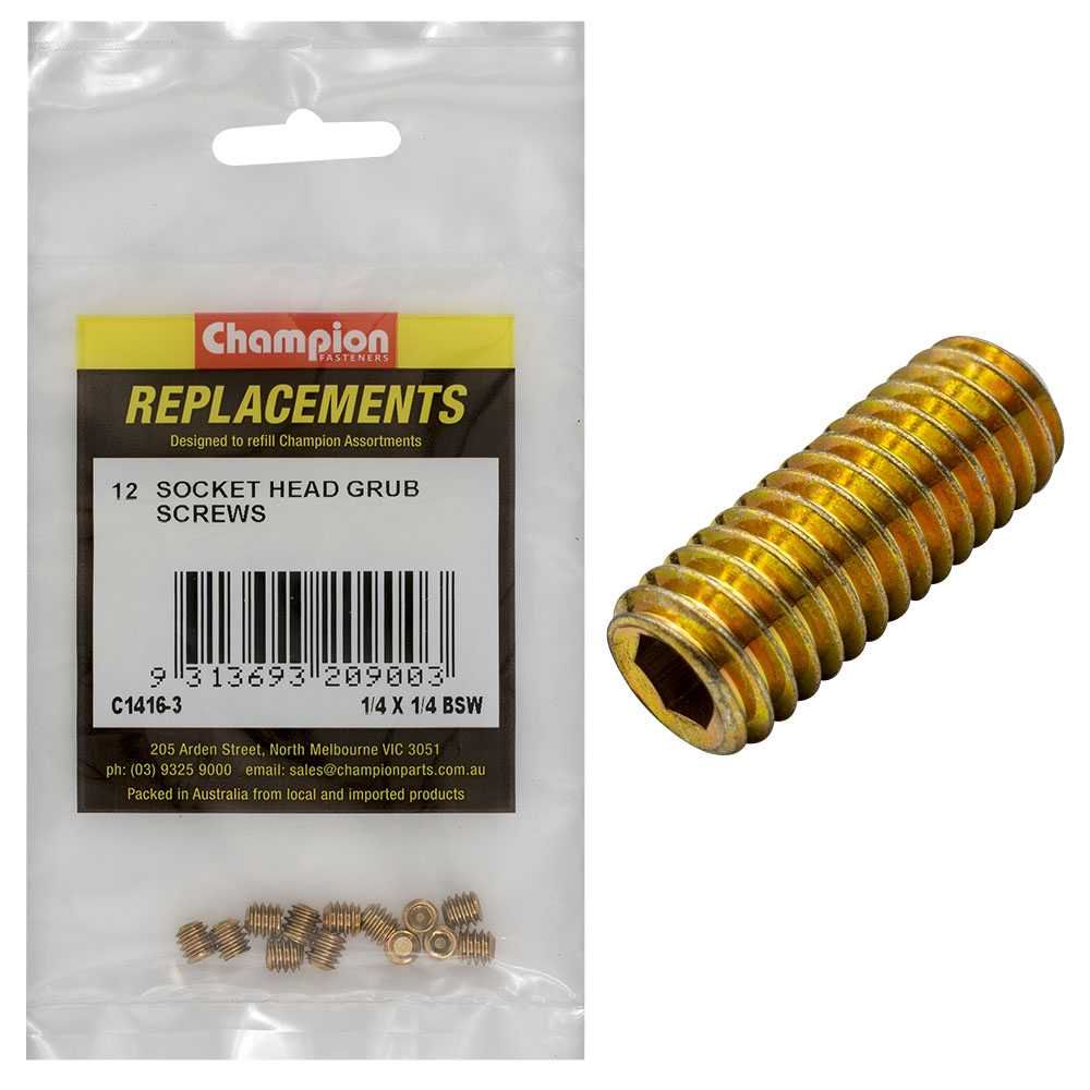 C1416-3 | Champion 1/4in x 1/4in BSW Socket Grub Screw -12pk Description High Tensile 8.8 Pack Size: 12