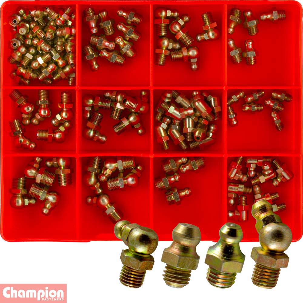 CA109 | 105pc Metric Grease Nipple Assortment Straight and Angle Nipples. Metric Fine and Coarse. 12 Sizes: 6mm to 10mm Dia. 105 Pieces Replacement Packs Available Part # Size Pack Qty C109-1 6 x 1mm Straight 40 C109-2 6 x 1mm Self-Tapping 7 C109-3 6 x 1mm 45° 10 C109-4 6 x 1mm 90° 8 C109-5 8 x 1mm Straight 8 C109-7 8 x 1mm 45° 5 C109-8 8 x 1mm 90° 5 C109-9 8 x 1.25mm Straight 5 C109-11 8 x 1.25mm 90° 5 C109-12 10 x 1mm Straight 4 C109-13 10 x 1mm 45° 4 C109-14 10 x 1mm 90° 4