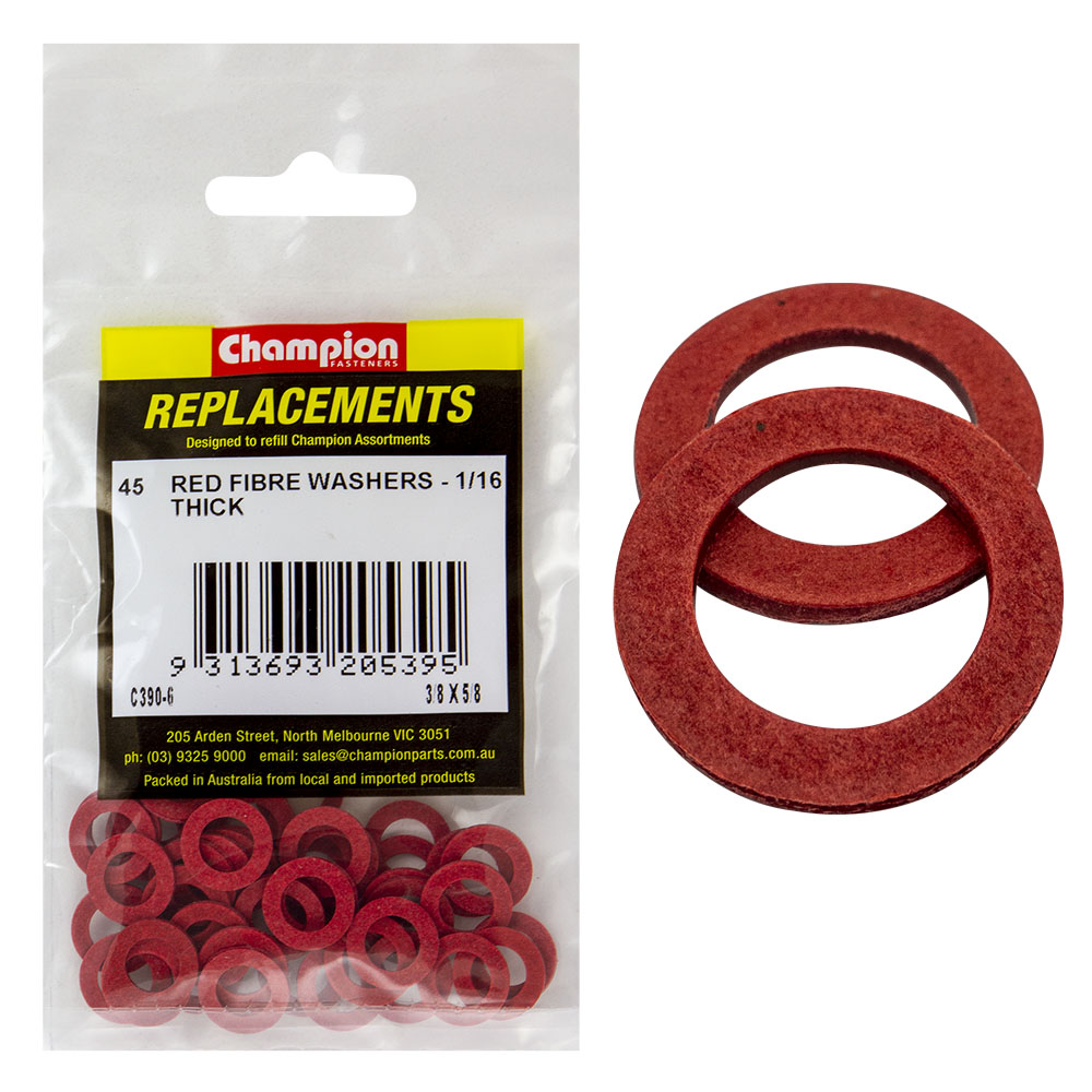 C390-6 | Champion 3/8in x 5/8in x 1/16in Red Fibre Washer -45pk Specifications Red Fibre Thickness: 1/16 Pack Size: 45