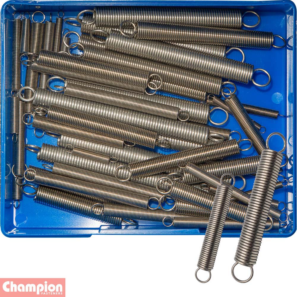 CA1801 | Champion 48pc Extension Spring Assortment S/Steel Description Metric Stainless Steel GR 316/A4 12 Sizes: 25mm to 120mm Length 5mm to 14mm Dia. 48 Pieces Part No. Description QTY C1801-25 120 x 12 x 1.8mm-316/A4 4 C1801-26 100 x 14 x 1.6mm-316/A4 4 C1801-27 95 x 12 x 1.4mm-316/A4 4 C1801-28 62 x 12 x 1.4mm-316/A4 4 C1801-29 75 x 11 x 1.2mm-316/A4 4 C1801-30 62 x 9 x 0.9mm-316/A4 4 C1801-31 78 x 9 x 0.9mm-316/A4 4 C1801-32 72 x 7 x 0.8mm-316/A4 4 C1801-33 50 x 7 x 0.8mm-316/A4 4 C1801-34 50 x 6 x 0.5mm-316/A4 4 C1801-35 25 x 6 x 0.6mm-316/A4 4 C1801-36 38 x 5 x 0.5mm-316/A4 4
