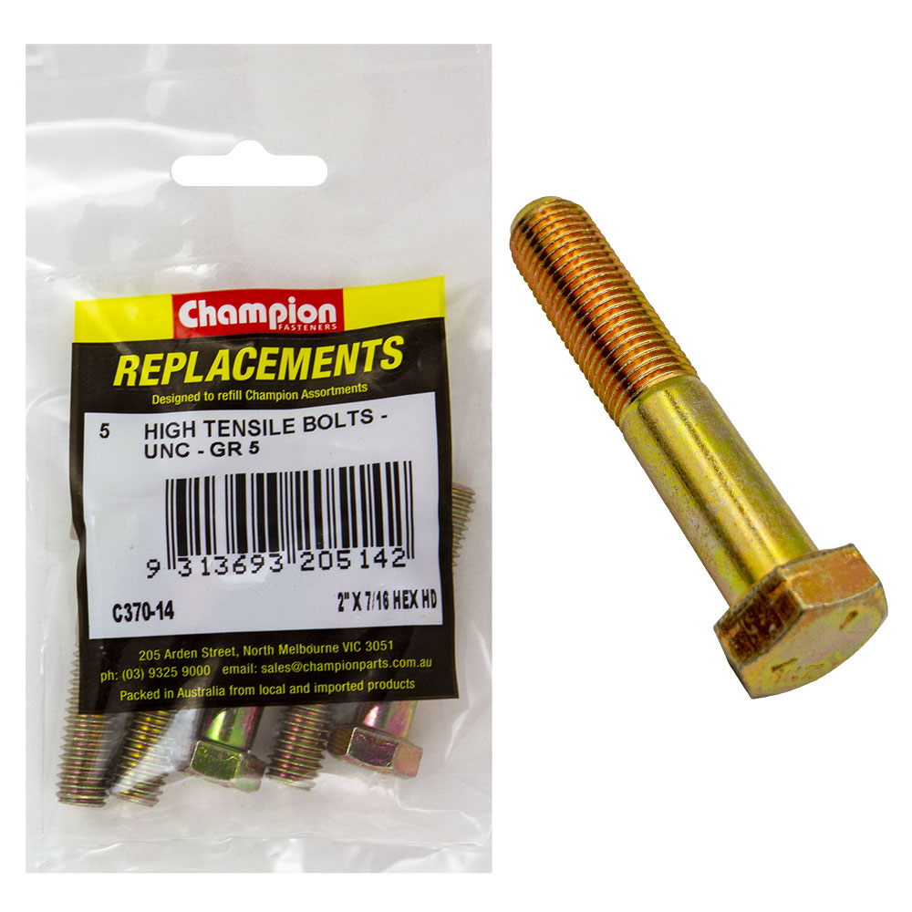 C370-14 | Champion 7/16in x 2in UNC Bolt -Gr5 -5pk