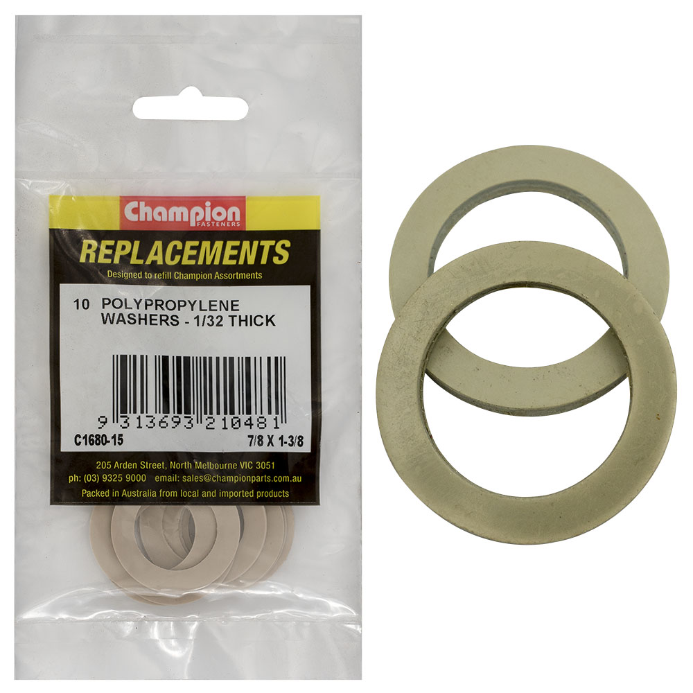 C1680-15 | Champion 7/8in x 1-3/8in x 1/32in Polypropylene Washer -10pk Description Thickness: 1/32 Pack Size: 10