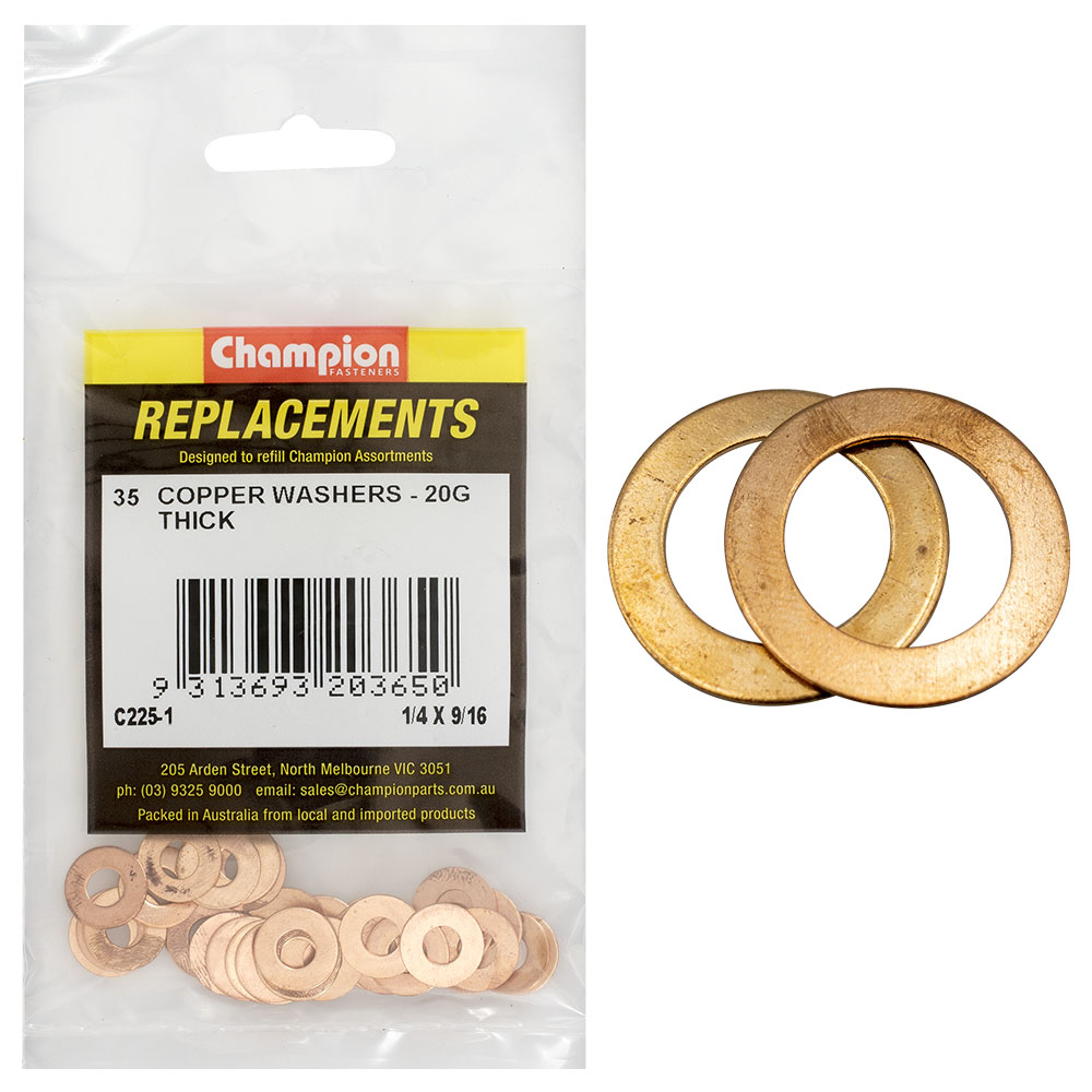 CDP11|Champion Copper Sump Plug Washers – 5pk Description 5 Sizes: 1/2 x 7/8 9/16 x 15/16 5/8 x 1 11/16 x 1-1/16 1 x 1-1/2 Copper Pack Size: 5