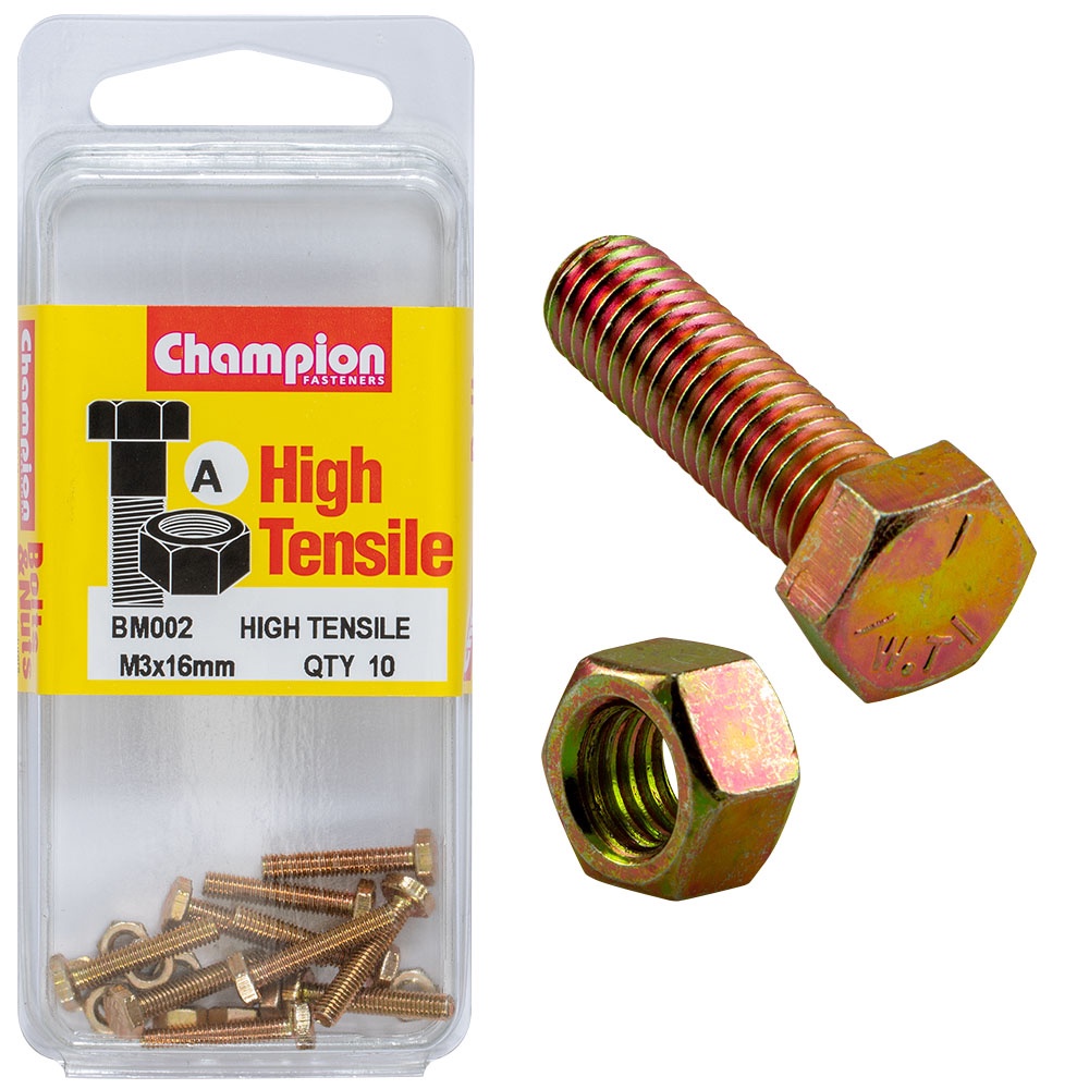 BM002 | Champion Hex Set Screw High Tensile M3x16mm Grade 8.8 – 10pk Specifications M3x16mm METRIC Zinc Plated HIGH TENSILE GRADE 8.8