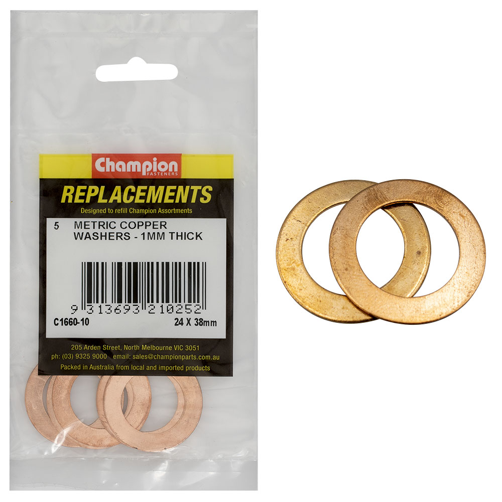 C1660-10 | Champion M24 x 38mm x 1.0mm Copper Washer -5pk Description Thickness: 1mm Pack Size: 5