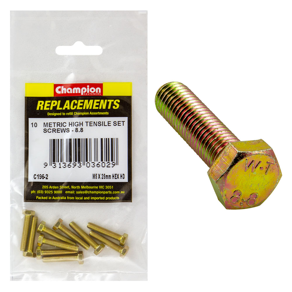 C196-2 | Champion M5 x 25mm x 0.8 Set Screw -Gr.8.8 -10pk Description High Tensile 8.8 Zinc Plated Pack Size: 10