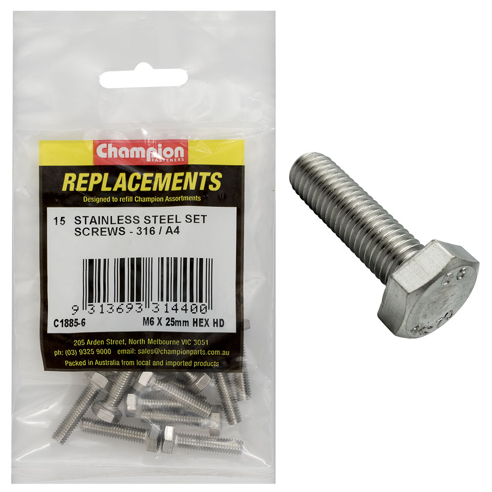 C1885-6 | Champion M6 x 25mm Hex Set Screw -316/A4 -15pk Description HEX Head Stainless Steel 316/A4 Pack Size: 15