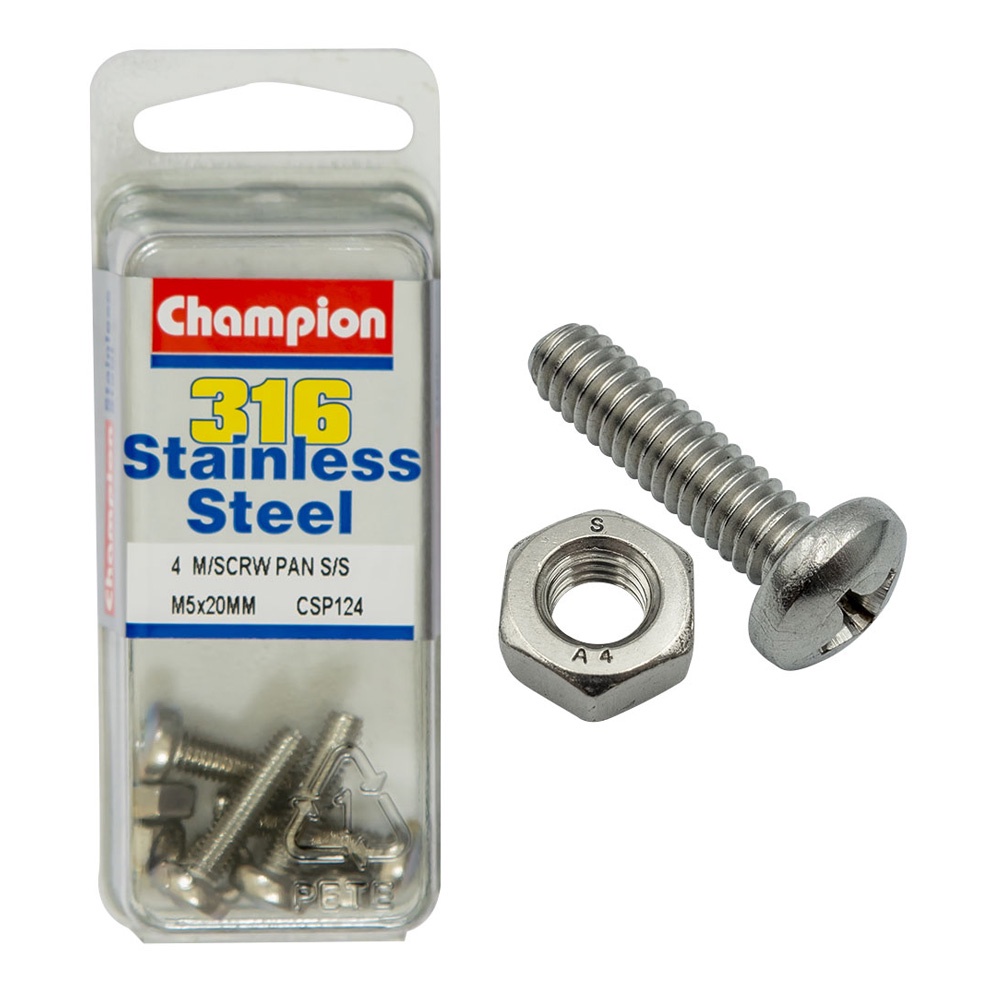 Champion Machine Screws Pan Phillips SS M5 x 20mm 316/A4-8pk