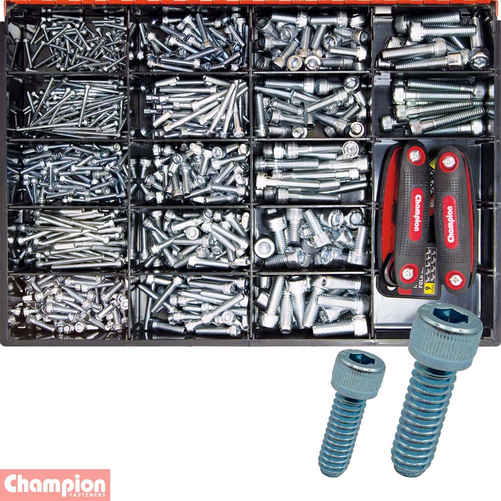 CA5417 | Champion 782pc H/Tensile Socket Head Cap Screw Assortment High Tensile Grade 8.8 Socket Head Cap Screws Metric Zinc Plated 2 Sets of Allen Included 38 Sizes: M3 x 10mm to M10 x 50mm 782 pieces Replacement Packs: PART NO. PACK QTY DESCRIPTION M91203010 25 *3 x 10mm – Z/P M91203016 25 *3 x 16mm – Z/P M91203020 25 *3 x 20mm – Z/P M91203025 25 *3 x 25mm – Z/P M91203030 25 *3 x 30mm – Z/P M91203050 25 *3 x 50mm – Z/P M91204010 25 *4 x 10mm – Z/P M91204016 25 *4 x 16mm – Z/P M91204020 25 *4 x 20mm – Z/P M91204025 25 *4 x 25mm – Z/P M91204030 25 *4 x 30mm – Z/P M91204050 25 *4 x 50mm – Z/P M91205010 25 *5 x 10mm M91205016 25 *5 x 16mm M91205020 25 *5 x 20mm M91205025 25 *5 x 25mm M91205030 25 *5 x 30mm M91205040 25 *5 x 40mm M91205050 25 *5 x 50mm M91206010 25 *6 x 10mm M91206016 25 *6 x 16mm M91206020 25 *6 x 20mm M91206025 25 *6 x 25mm M91206030 25 *6 x 30mm M91206040 25 *6 x 40mm M91206050 25 *6 x 50mm M91208016 15 *8 x 16mm M91208020 15 *8 x 20mm M91208025 10 *8 x 25mm M91208030 10 *8 x 30mm M91208040 10 *8 x 40mm M91208050 10 *8 x 50mm – Z/P M91210016 10 10 x 16mm M91210020 10 10 x 20mm M91210025 10 10 x 25mm M91210030 10 10 x 30mm M91210040 10 10 x 40mm M91210050 10 10 x 50mm CFK-M 1 FOLD KEY SET – METRIC HEX – 8 SIZES CFK-MB 1 FOLD KEY SET – METRIC HEX BALL – 8 SIZES