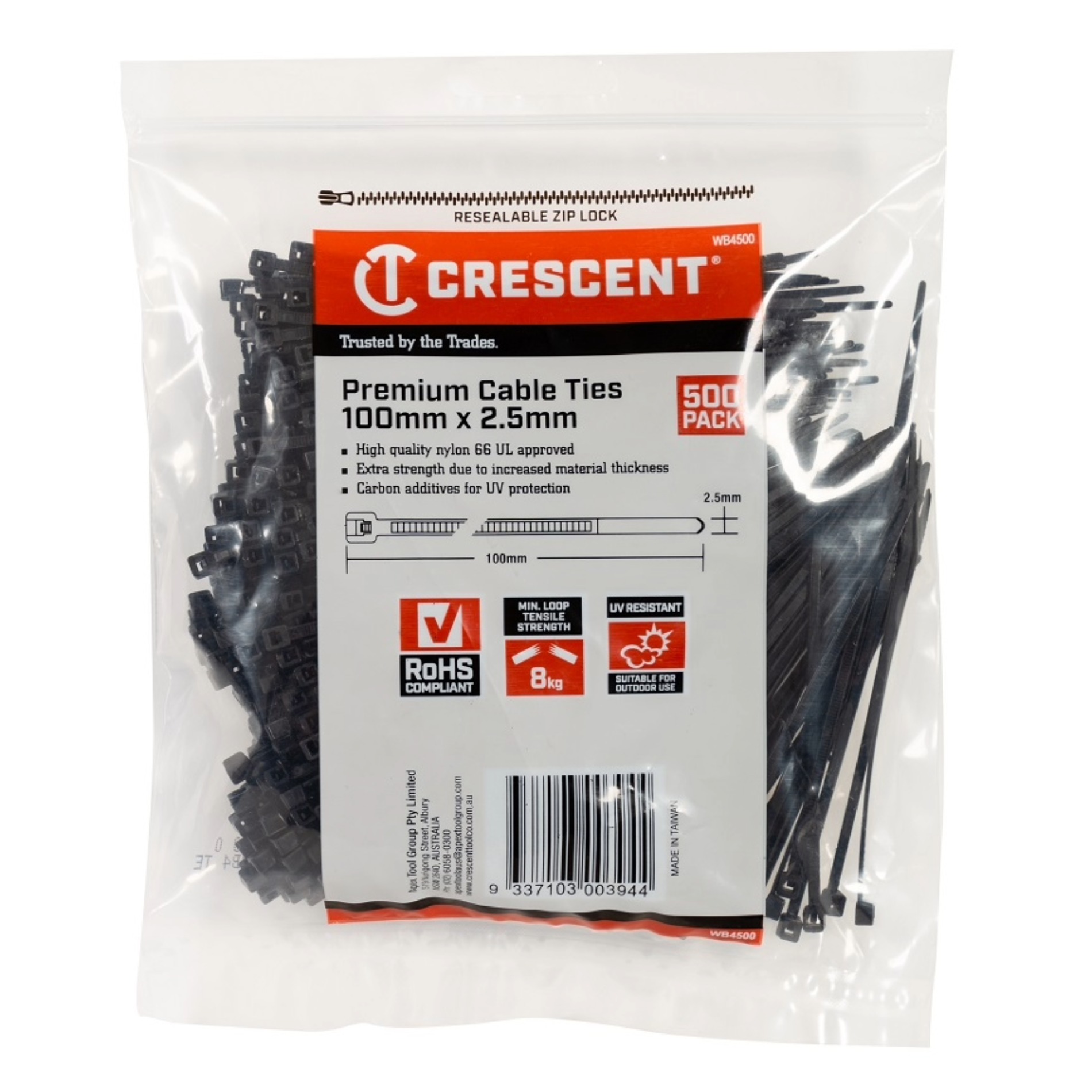 Crescent Cable Ties are high quality, self-locking nylon cable ties that come packaged in a handy, resealable zip lock bag which enhances the life expectancy of the ties. The black cable ties are UV resistant, which prolongs useful life under sunshine/outdoor applications. Available in a range of sizes, these nylon UL approved cable ties are resistant to most chemical acids and are ideal for use in the home, office or workshop.