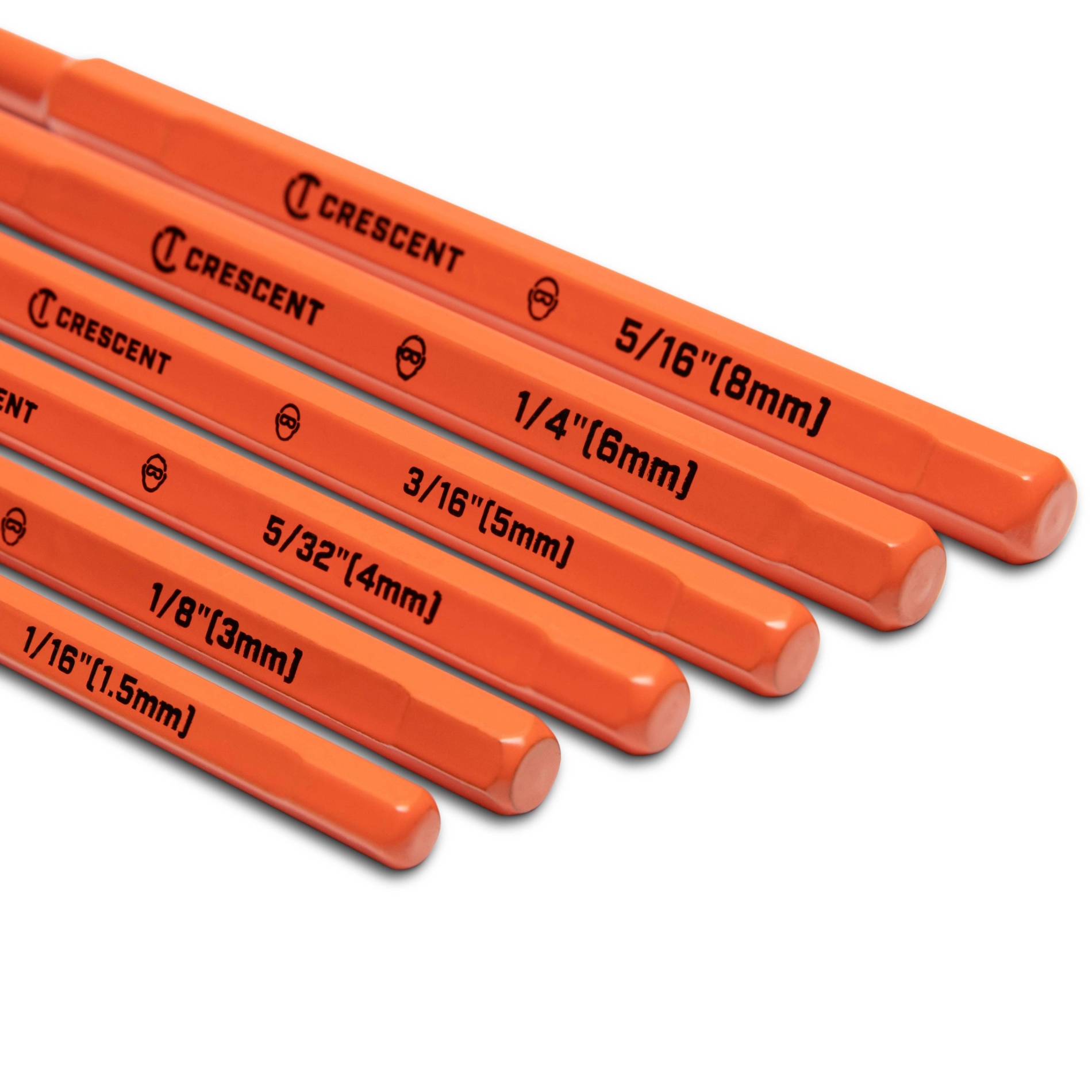 Crescent Cold Chisels, Wood Chisels, Nail Punches and Pin Punches are designed to deliver the best in durability, safety, and ease-of-use, with extra-large strike caps that are hardened to prevent mushrooming. Shanks of wood chisels and nail punches have a full metal core for extra durability, while cold chisels feature a recessed “control panel” and longer shanks for extra comfort, safety, and access. Bold size markings and their high-visibility color make Tradesman pin punches easy to find and select in any toolbox. Recessed Control Panel design allows quicker and more accurate positioning to help jobs go faster.