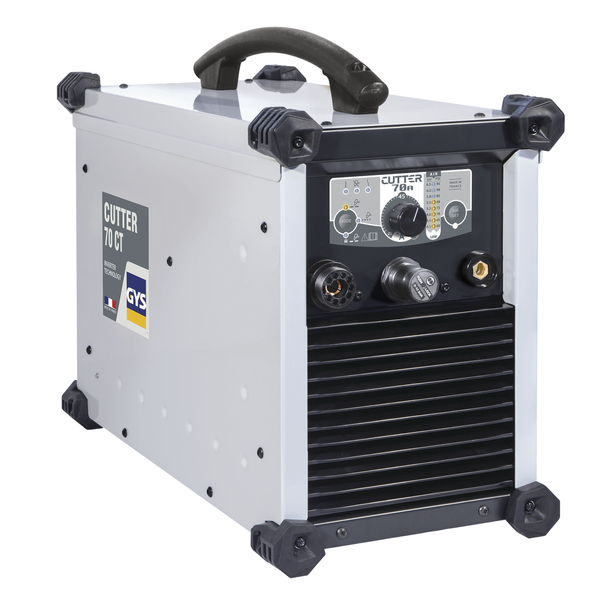 The CUTTER 70 CT is a 70 A plasma cutter with a cutting capacity of 35 mm thick on a multitude of materials The HFfree arcing system preserves and increases the lifetime of consumables Designed to be used in difficult environments it has very robust mechanics and a user friendly control panel It is prewired for use on automatic cutting tablesMAXIMUM PRODUCTIVITY Faster cutting speed using oxygas Cuts all types of steel mild stainless tempered HLE aluminium copper etc Optimised cooling using the ventilation corridor that helps isolate the electronic components from the dust Replacement of consumables is fast amp easy for maximum productivity Duty cycle 70 A at 60 40CHIGHPERFORMANCE TORCH Premium torch TECMO leading supplier in Europe Premium cutting quality the torch is air cooled offering a great arc stability for all types of work Consumables compatible with Hypertherm Designed to be shock and heat resistant Quick connectdisconnection of the torch no tools required for transport or maintenance Easy to use trigger mechanism for added comfortEFFECTIVE IN EVERY WORKPLACEUser friendly interface 3 working modes Cutting Mesh locked manual setting of the air pressure 41 lt 65 bars using front LED Indicator HFfree ignition to prevent disturbances that could interfere with nearby electronic equipment Compatible with CNC kit for automatic cutting tablesDESIGNED TO LAST Reinforced metal case amp non slip rubber pads IP 23 protection rated Compact and PortablePERFORMANCECapacityThicknessSeparation 35mmClean cut25mmPiercing15mmCapacityRemoval rateDegouging 48kgh