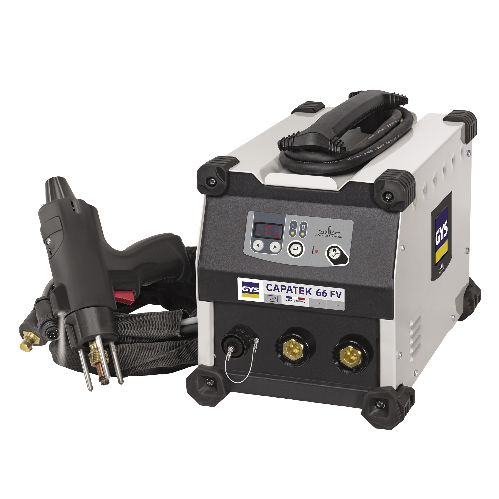 The CAPATEK 66 FV is an industrial shrinkage capacitive discharge generator capable of welding diameter studs M3 to M8 in copperplated steel stainless steel aluminium and brass on thin sheets without marks or deformation Its ergonomic gun and revolutionary with adjustable shrinkage and effort ensures an ultrafast welding rate Its FV technology allows it to be used on all singlephase networks 85 to 265 VMAXIMUM PRODUCTIVITY66 mF capacitor dischargeCooldown from 0 to 5 secWide choice of studs from M3 to M8Length of compatible studs 6 to 40mmCONTACTGUN Adjustable force from 25 to 100 N with enclosure to prevent unintentional handlingIndependent tripod design with bayonet lock for better gun stability during welding and easy placement of chucksTrigger for easy control of welding actionLED lighting of the welding area Unique presence on the market several functions LED fast flashing error station charging LED slow flashing reach expected stud countingINTUITIVE INTERFACEVoltage adjustment from 50 V to 200 VLocking settingsStud counter with adjustable threshold incremental or decrementalINDUSTRIAL DESIGNSurge protected up to 400 V PROTEC 400Reinforced bodywork and antishock pads on all external sidesEasy change of welding polarity by 3550 bayonet connectorComes with two split ground clamps to avoid the effects of magnetic blowingHandle with builtin AC cable reelAutomatic standbyONOFF switch located on the back of the generatorActive ventilation as neededOption amp ConsumablesAccessory box with mandrels for studs M3 M4 M5 M6 amp M8 ref 081000