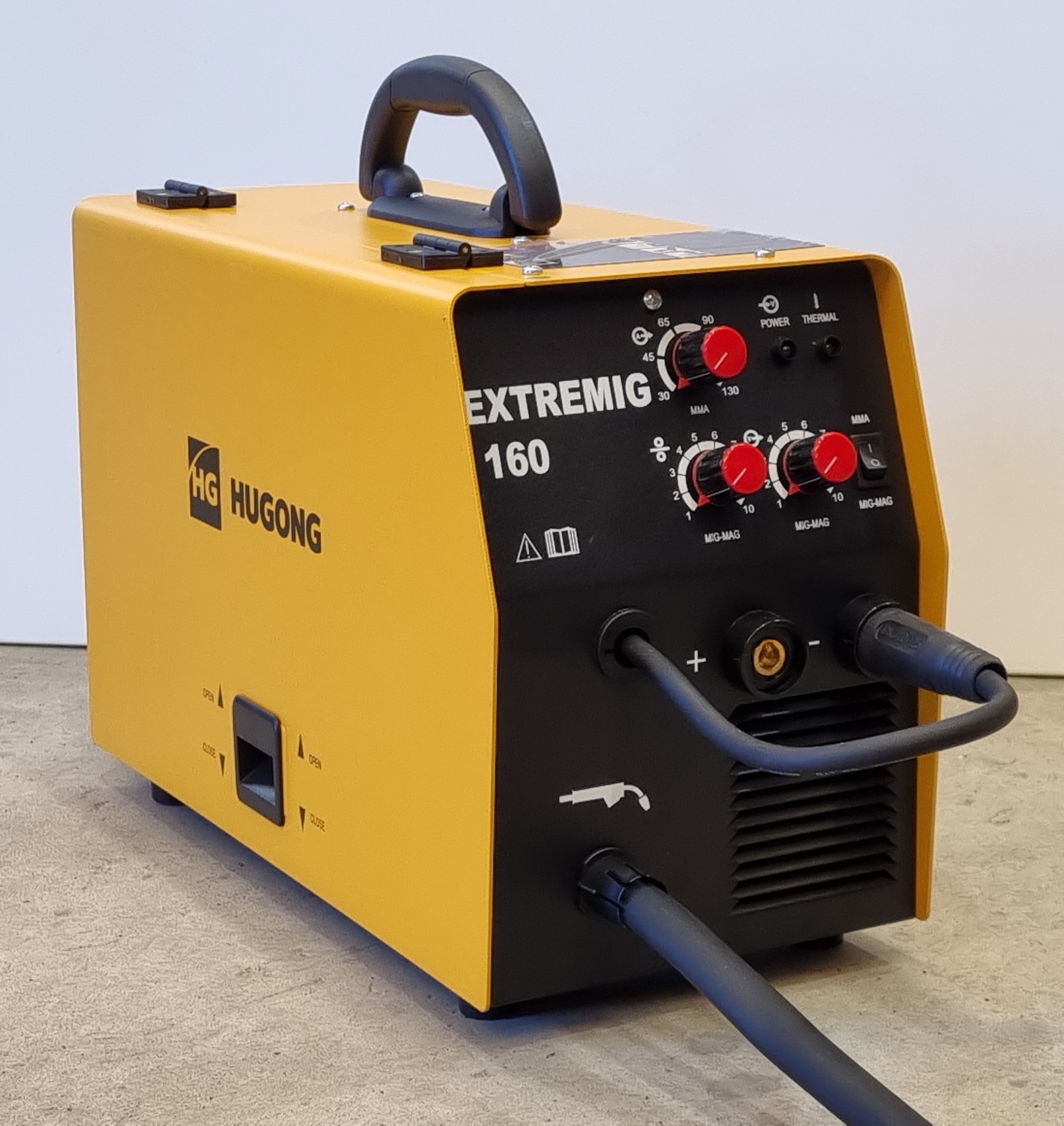 The Hugong Extremig 160 III is an entry level 160amp MigStick welder ideally suited to the home workshop It caters for both gas and gasless welding It contains quality inverter technology and features stepless ampvolt control This little welder packs a real punch for its size and is capable of welding 05 8mm thick steelFEATURES IGBT Inverter Stepless Amp Volt Adjustment Thermal Overload Protected Mig Stick Function Fan Cooled Single Phase Generator Safe Gas Gasless CapableTECHNICAL DATAInput Power V 230Rated Input Current 1eff A 124Max Input Current A 285ARated Input Capacity KVA 621Open Circuit Voltage V 68Welding Current Range A GMAW 30 160 MMAW 30 130Duty Cycle A 60 160Weight KG 113Wire Feed mm 06 08Electrode Size mm 16 323 Year Commercial Warranty