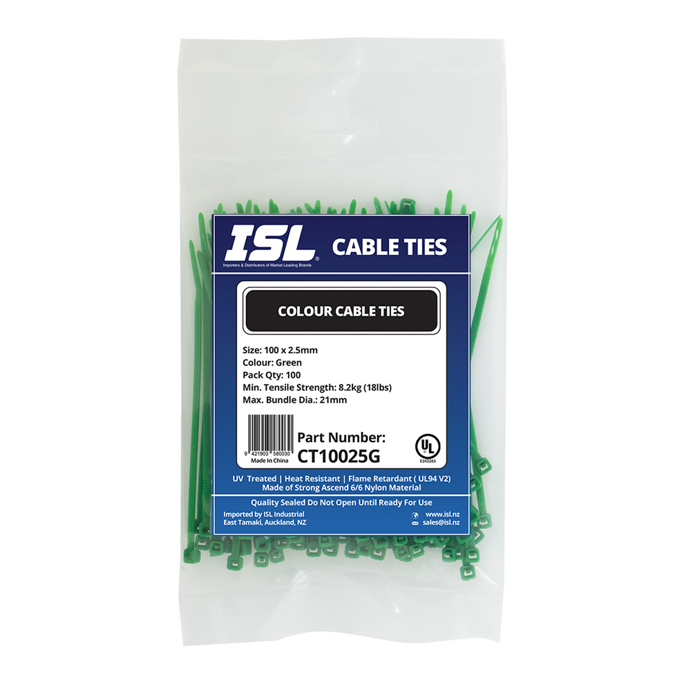 ISL 100 x 2.5mm Nylon Cable Tie – Green – 100pk