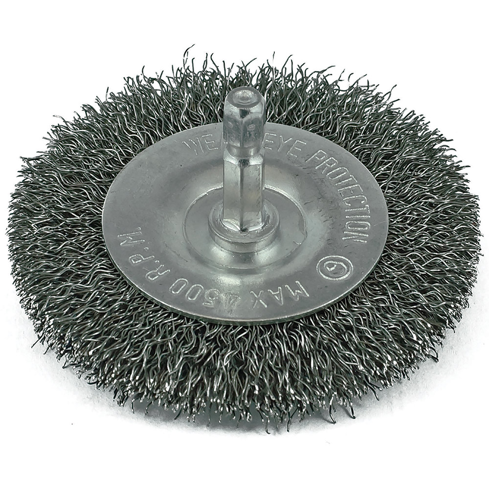 TM7022-050 | ITM Crimp Wire Spindle Mounted Wheel Brush 50mm Specifications Material: Steel Wire Diameter: 50mm Shank: 1/4 Hex Width: 7mm Wire Diameter: 0.3mm Max RPM: 4 500