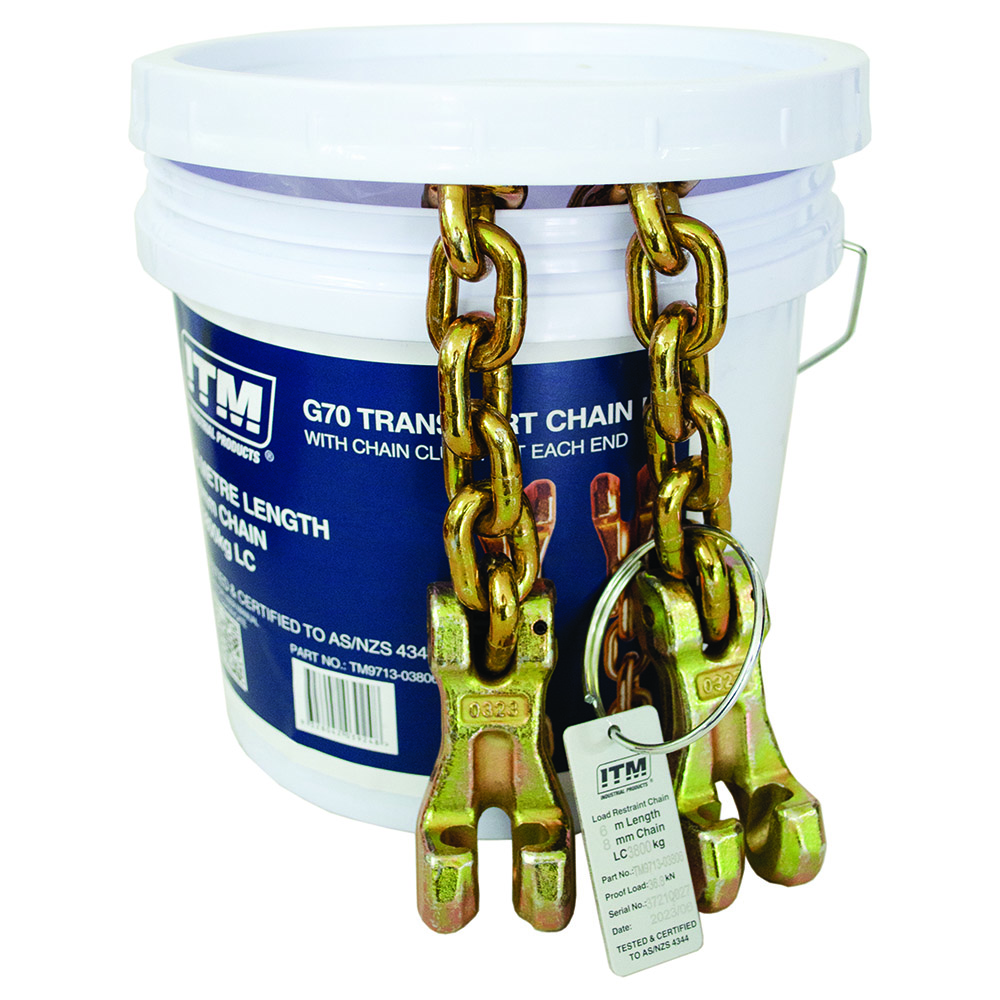 TM9713-03806| ITM G70 Transport Chain w/ Claw Hooks At Each End 3.8 Ton Lashing Capacity 6M Length Zinc Di-chromate coated Supplied in convenient pre-cut lengths Fitted with metal test tag Tested & certifified to AS/NZS 4344 Lashing Capacity: 3800kg Chain Size: 8mm Length: 6m