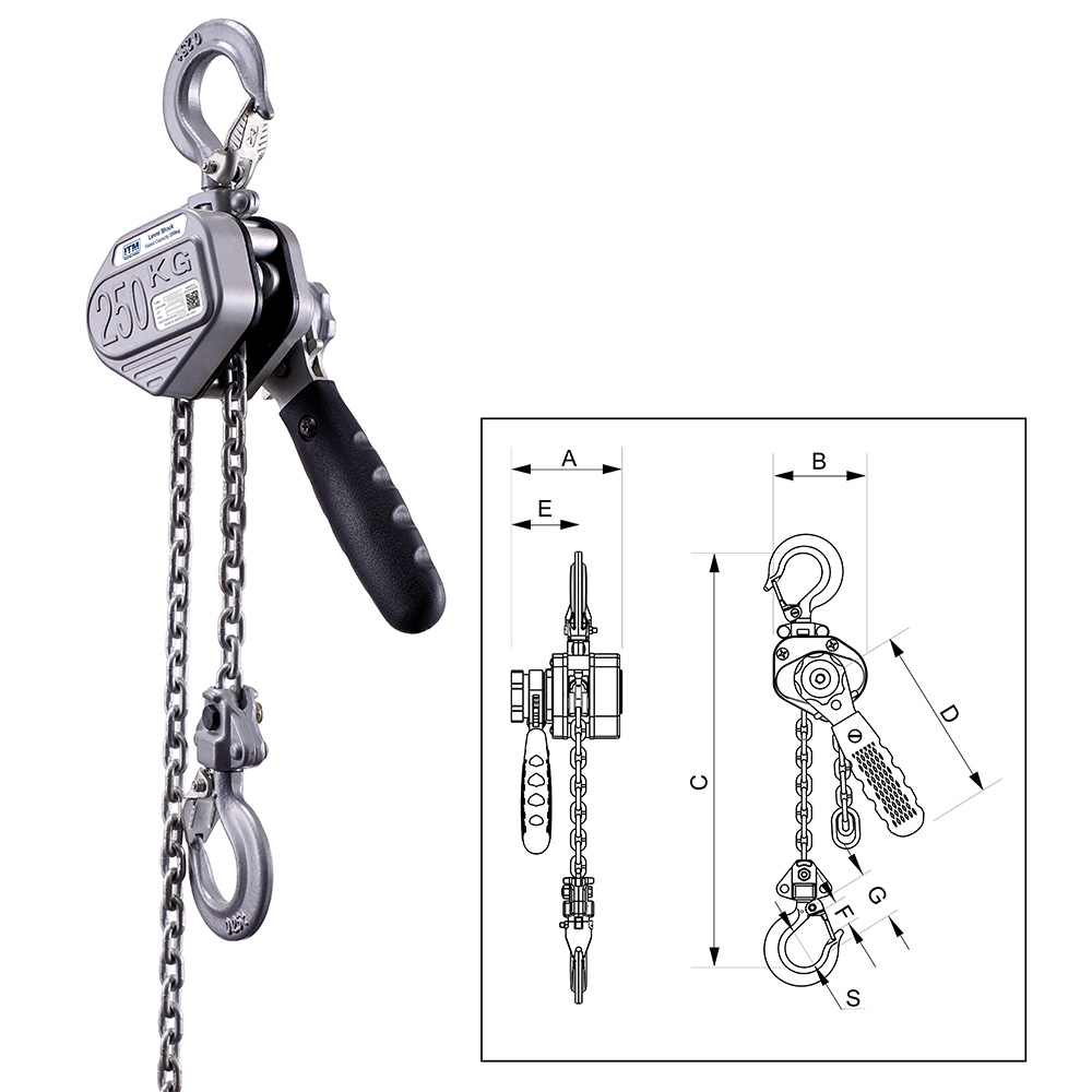 TM9040-00201| ITM Lever Hoist Mini 250 kg 1.5 Meter Lift • Load limited protection system • Automatic double pawl braking system • Hooks fitted with spring safety latches • Tested & certified to AS 1418.2 • 250kg Rated capacity • 1.5m Standard lift • 4mm Grade 80 chain • Weight: 2.4kg • Dimensions (mm) A: 98 B: 82 C: 250 D: 165 E: 60 F: 36 G: 20.5 S: 32.5