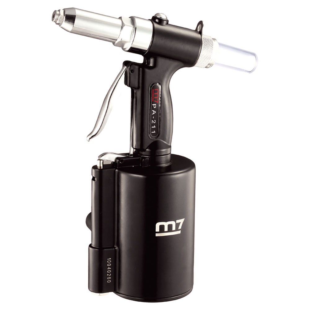 M7-PA211 | M7 Hydraulic Air Riveter 18mm Stroke FEATURES Superb quality pneumatic air riveter. SPECIFICATIONS Traction Power: 3748lb.f / 1700kgf Stroke Length: 18mm Capacity: 2.4-6.4mm Air Requirement: 90PSI / 2.9CFM Air Inlet: 1/4 Net Weight: 1.75kg Sound Pressure: 79.7 dBA Vibration Level: 0.8m/s² Aluminium Rivet & Aluminium Mandrel: 1/4 (6.4mm) Aluminium Rivet & Steel Mandrel: 1/4 (6.4mm) Steel Rivet & Steel Mandrel: 1/4 (6.4mm) Stainless Rivet & Steel Mandrel: 1/4 (6.4mm) Stainless Rivet & Stainless Mandrel: 1/4 (6.4mm)