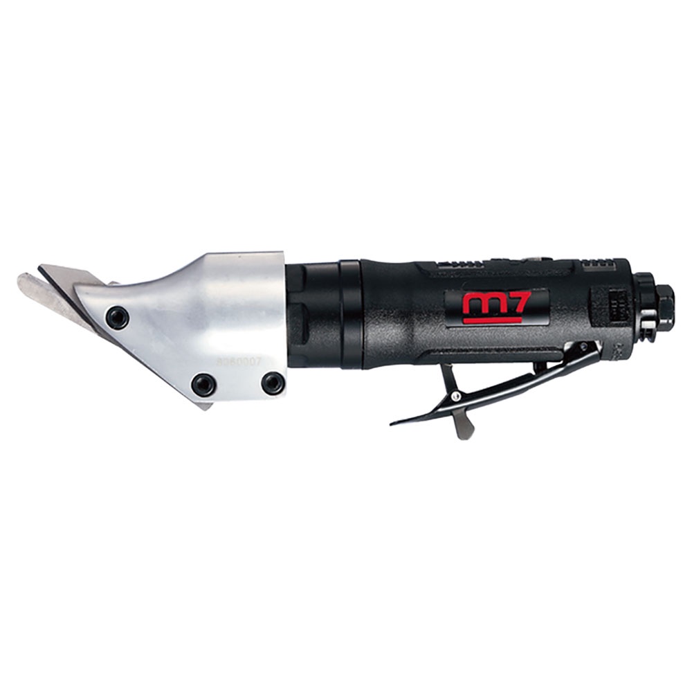 M7-QG102 | M7 Shear Straight Style 2600spm 1.6mm Capacity FEATURES Heat treated shear blades for long lasting cutting performance. SPECIFICATION Strokes/min: 2600 S.P.M Air Requirements: 6 CFM / 90 PSI Inlet: 1/4 Vibration Level: 2.4m/s² Overall length: 254mm Weight: 1kg Air hose: 3/8in Sound Pressure: 85.8 dBA Cut capacity: Stainless (1.0mm) Mid Steel (1.2mm) & Aluminum (1.6mm)