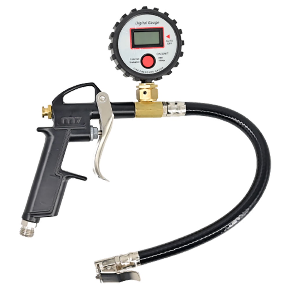 M7-SB201B | M7 Digital Tyre Inflator Max: 11.0 Bar 30Cm Hose FEATURES BAR readout. Clip type nozzle SPECIFICATIONS Max Pressure: 11BAR Avg Air Consumption: 1.41CFM (at 100PSI) / 90PSI Air Inlet: 1/4 Net Weight0.32kg Nozzle Length: 300mm
