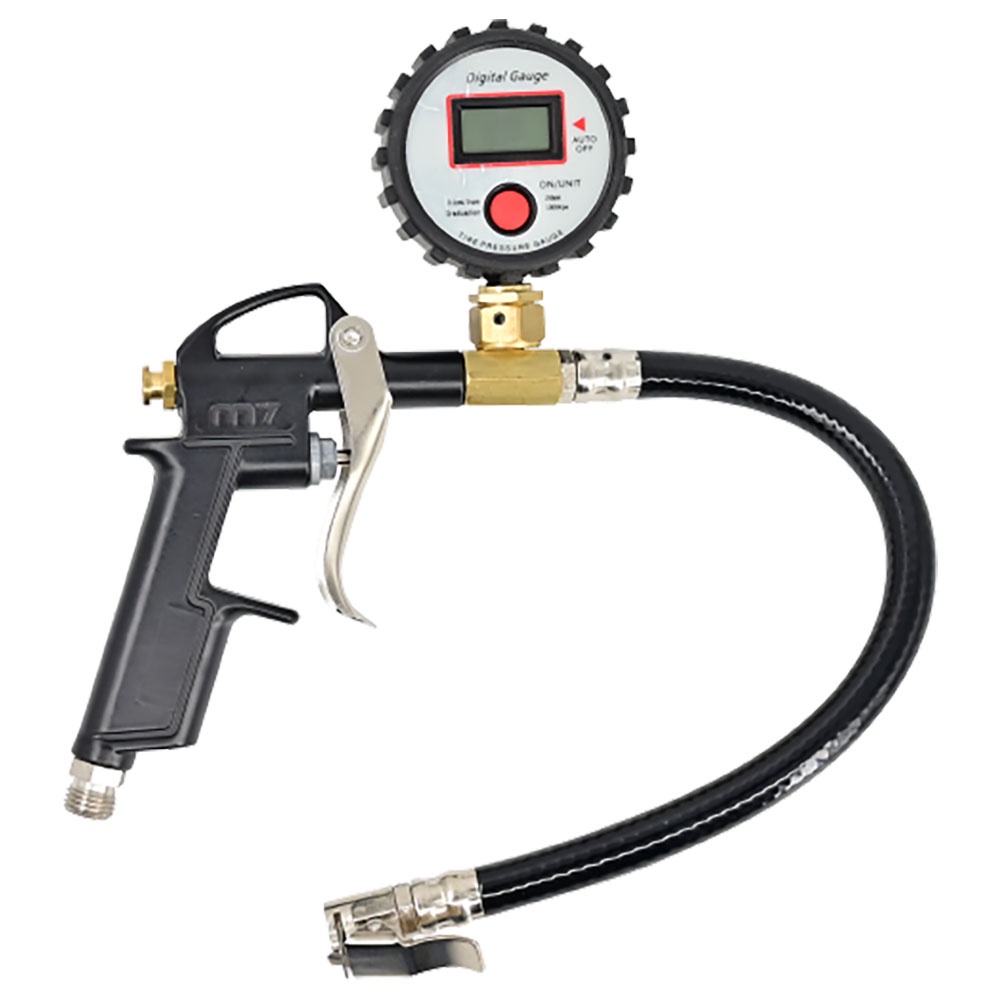 M7-SB201P | M7 Digital Tyre Inflator Max: 160psi 30Cm Hose FEATURES PSI readout. Clip type nozzle SPECIFICATIONS Max Pressure: 160PSI Avg Air Consumption: 1.41CFM (at 100PSI) / 90PSI Air Inlet: 1/4 Net Weight0.32kg Nozzle Length: 300mm