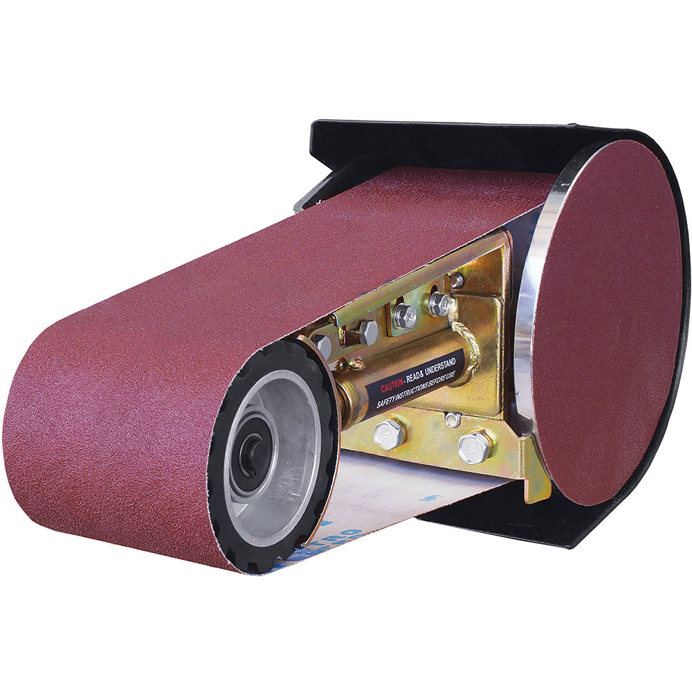 PO364 | Multitool Belt & Disc Grinding Attachment 915x100mm Features The Multitool is a renowned Australian designed belt grinding attachment which can be used on most bench grinders. The technology replaces the grinding wheel and converts a traditional grinder into a sophisticated work station ideal for sanding grinding sharpening shaping polishing and refinishing. EFFICIENCY – Superior performance and a user friendly toolless belt change in under 5 seconds. VERSATILITY – Grinding sanding or polishing in 4 positions on rubber contact wheel platen disc or free strapping. The unit can also be swivelled vertically or any position in between. ACCURATE TRACKING – The running position of the belt is simple to adjust and it stays there allowing for finishing into sharp corners. QUALITY CONSTRUCTION – Robust maintenance free with sealed ball bearings hardened and ground essential components and zinc plating. 3 YEAR WARRANTY – Against faulty materials and workmanship even when used commercially. Specifications 36 x 4 wide (915 x 100mm) belt. 7 (178mm) diameter disc. 3 1/2 (89mm) diameter rubber contact wheel. 5 1/2 (140mm) diameter drive wheel. Suits most popular 8 bench grinders with a screw mounted wheel guard and a minimum of 1/2 HP though 3/4 HP is recommended. Suits grinder shafts sizes of 5/8 and 1/2 . A steel bush is supplied to adapt the drive wheel to 1/2 . Fitting Kit supplied.