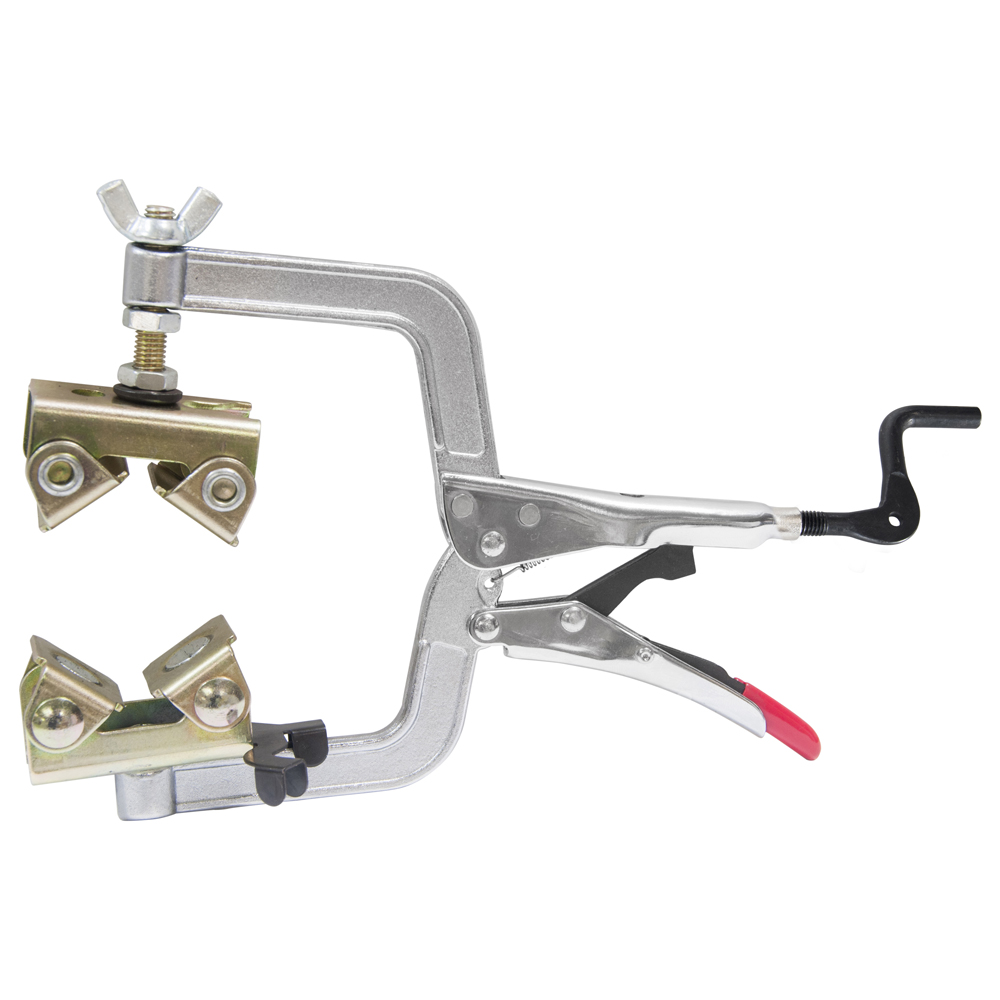 SHPG635V | Stronghand Pipe Plier with Adjustable Top Large V-Pads Pipe Pliers The convenient way to hold round or square tubes for butt-welding. Small Diameter Pipe Pliers are the convenient way to hold round pipes for butt-welding and cross-joints. The V-Pads on the Pipe Pliers adapt to many different shapes and sizes. OAL: 216 mm Top V-Pad: Adjustable Bottom V-Pad: 0° & 45° rotatable Throat Depth: 76 mm MAX Clamping Capacity: 38 – 64 mm Thread: M8 Weight: 0.5 kg