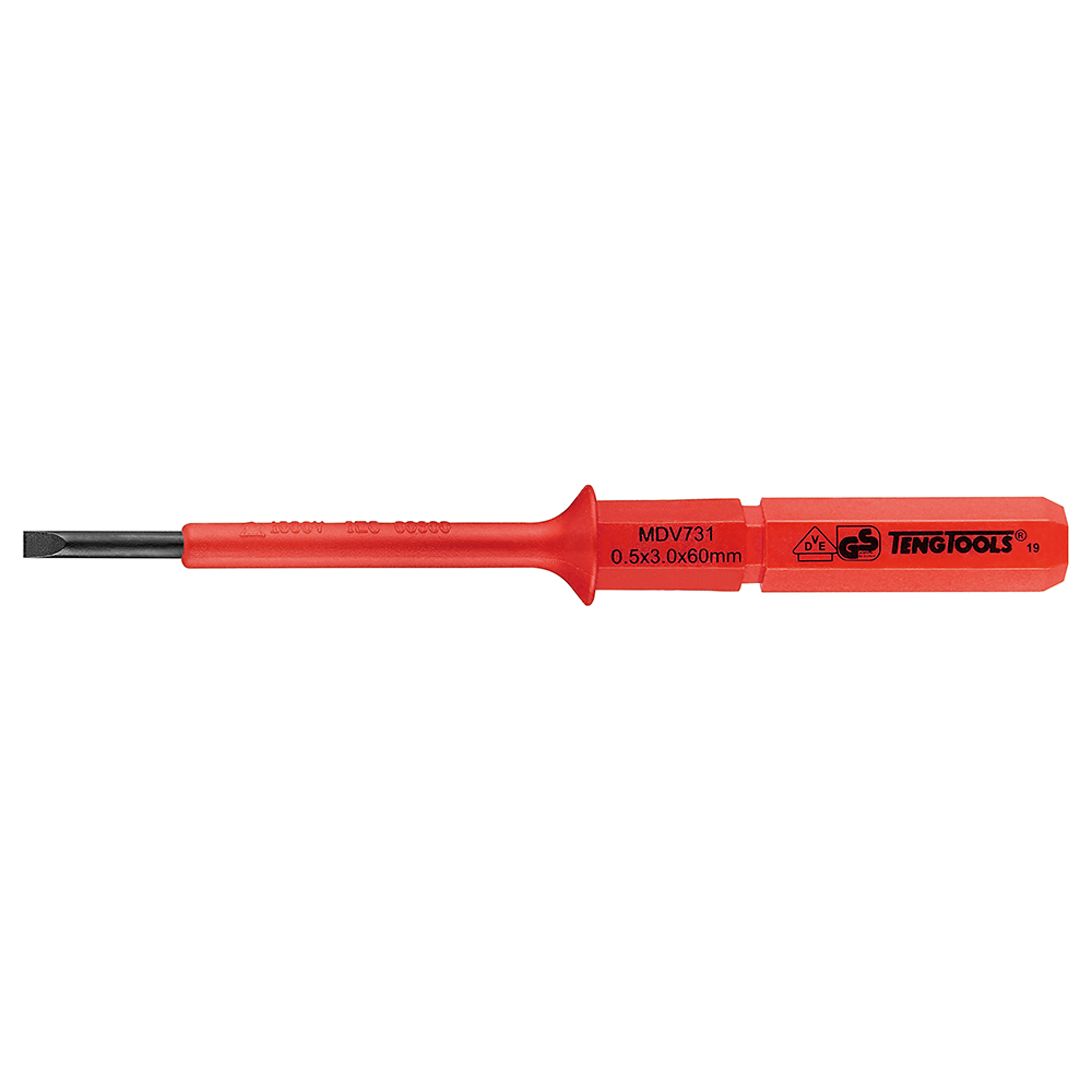 MDV731 | Teng 1000V Screwdriver Interchangeable 3mm Flat Flat (slotted) blade 1 000 volt insulated screwdriver blade For use with the interchangeable blade handles (MDV700 or MDV710) Approved for live working up to 1 000 volts Integrated protective insulation with two colours to clearly indicate if there is any damage to the insulation For use with slotted screws TT-MV PLUS steel alloy for greater strength and material flexibility