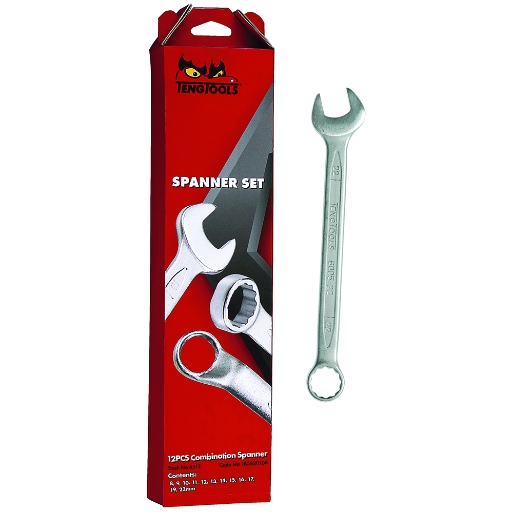6512 | Teng 12Pc Combination Spanner Set (MM) 12 piece metric combination spanner set with the same dimensions at both ends. The 12 point ring head is set at a 15° angle. The spanners feature polished heads with a satin finish and are supplied in a coloured display box. Combination Spanners Sizes: 8 9 10 11 12 13 14 15 16 17 19 22mm