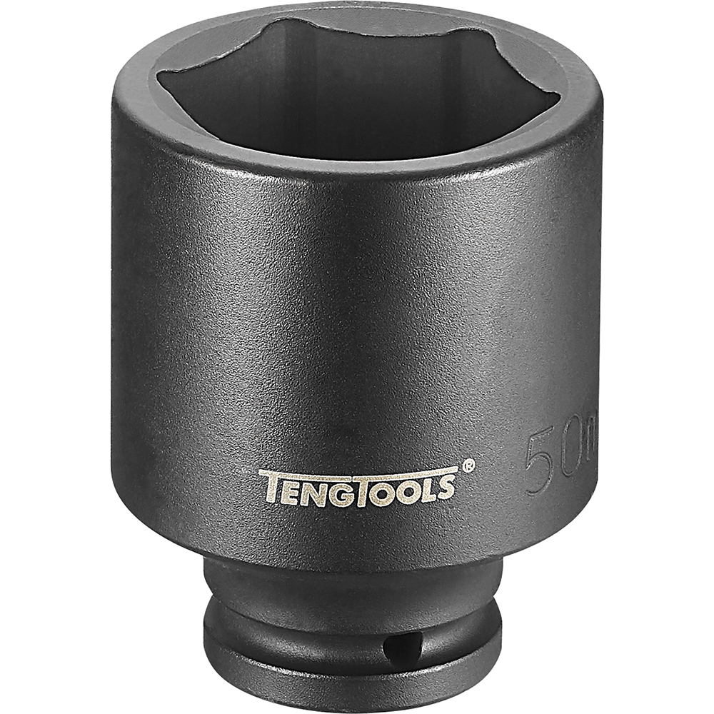 940650-C | Teng 3/4in Drive Air Impact Deep Socket Size 50mm Deep 6 Point Metric Manufactured of Chrome-Molybdenum according to GGG-W-6608 to guarantee the highest material quality. Marked with the size for quick identification. The 3/4in DIN standard is designed for use with a locking pin and ring to increase safety when working with Pneumatic Tools.