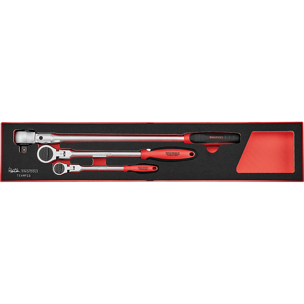 TEXRF03 | Teng 3pc Long Arm Ratchet Flex Head Set Foam Features 3-piece set with 1/4 3/8 and 1/2 long handle ratchets measuring 200mm 300mm and 400mm for improved leverage and torque Flexible ratchet heads with locking mechanism allow for use at different angles 8-degree increments between clicks ensuring controlled tightening and adjustments Twist reverse for easy direction changes and a quick-release button for efficient socket changes Bi-material grip and tethering facility for comfort and safety Contents 1400F – 1/4in Long Ratchet Flexible Head 43 Teeth 200mm 3800F – 3/8in Long Ratchet Flexible Head 41 Teeth 300mm 1200F – 1/2in Long Ratchet Flexible Head 45 Teeth 400mm