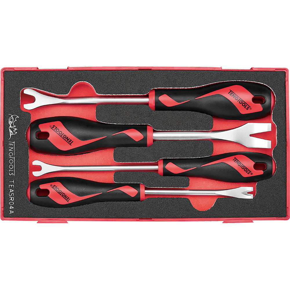 TEASR04A | Teng 4pc Clip & Panel Remover Set FOAM Remover tool for fastener clips for both interior and body clips Pivot points of blade tips are designed for appropriate leverage and to resist twisting. Easy access into confined areas Design for use on most common clips Organised in a foam inlay module size 1 (FOAM1) Content Clip Removal Tool U-shape Small & Large Panel Trim Tool V-shape Small & Large