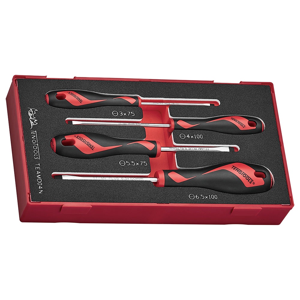 TEAMD04N | Teng Screwdriver Set Flat 4 Pcs Contents MD917N Flat Screwdriver 0.8 x 4.0 x 100mm S MD920N Flat Screwdriver 0.5 x 3.0 x 75mm S MD922N Flat Screwdriver 1.0 x 5.5 x 75mm S MD928N1 Flat Screwdriver 1.2 x 6.5 x 100mm L