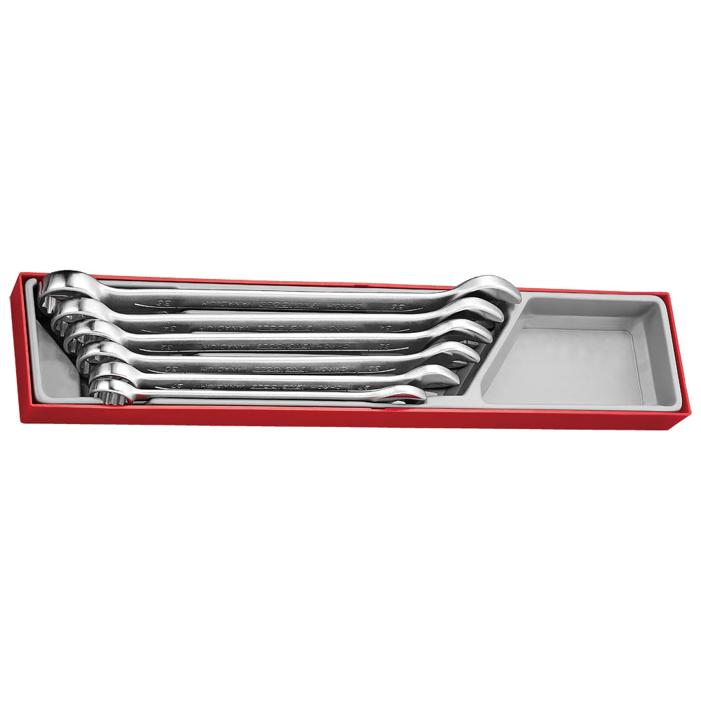 TTX2436 | Teng 6pc Combination Spanner Set Chrome vanadium satin finish Off set at 15 degree for easier use on flat surfaces TengTools hip grip design for contact with the flat side of the fastening Designed and manufactured to DIN3113A Organised in a tool tray module size X4 (TTX4) Sizes: 24 27 30 32 34 36 mm