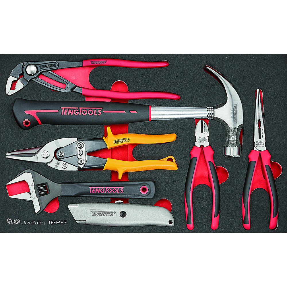 TEFMB7 | TENG PLIER AND HAMMER SET 7 PIECES 7 piece plier and hammer set with all tools laid out in three colour pre-cut EVA foam which clearly shows if any tools are not in their place. Designed to fit exactly in the TC-SC Service Case and can be used as a set on its own or as part of the Get Organised system. Pliers 6 side cutters 8 long nose pliers 10 quick set water pump pliers Wrenches 8 wide jaw adjustable wrench Cutting tools Utility Knife Straight cut high leverage tin snips Hammers 16oz claw hammer Dimension: 420 x 265 x 56mm Weight: 1.8kg