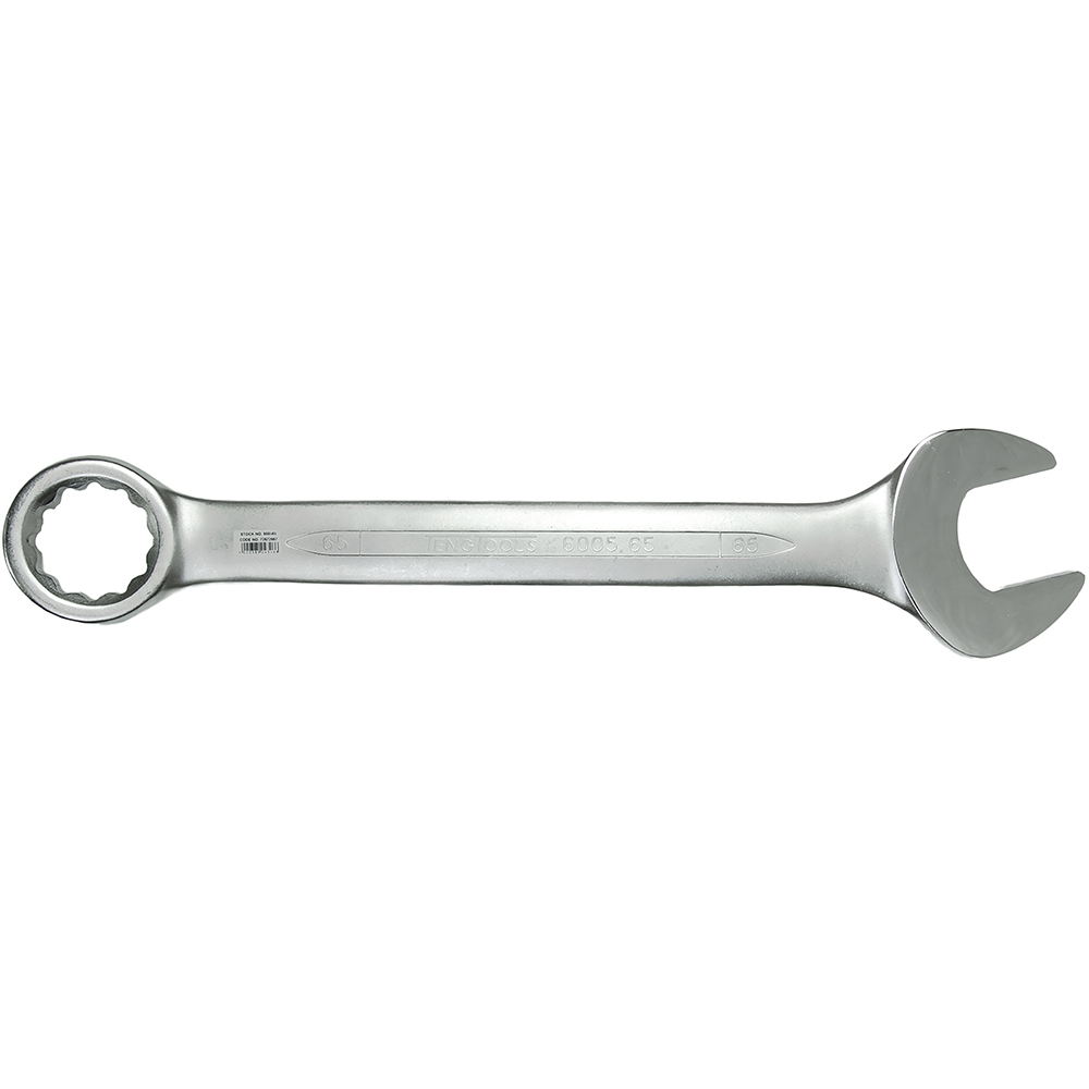TengTools Combination Spanner 600565 – 65mm Manufactured and designed in accordance with DIN3113A from high grade Chrome Vanadium Steel. Same dimensions at both ends. The 12 point ring end is set at a 15° angle. Hip grip ring ends to drive on the flat rather than the corner to help avoid damage to fastenings and to enable use on previously damaged fastenings. Polished heads. Satin finish.