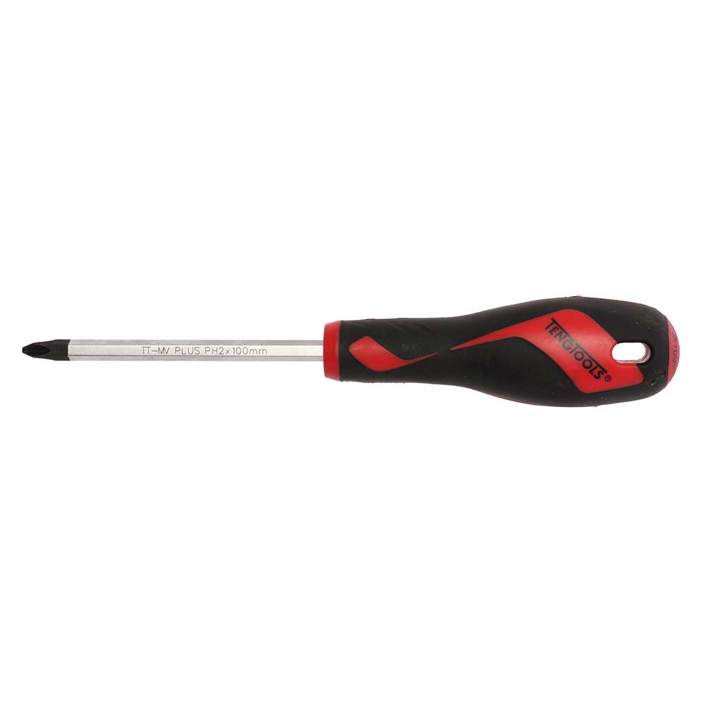 TengTools Screwdriver – Phillips Head Shaft of TT-MV PLUS steel. Phosphated black tip. Ergonomically designed two component handle with hanging hole. DIN 5260 Phillips Head: No. 2 Blade Design: 6-point Blade Length: 100mm Handle Length: 116mm