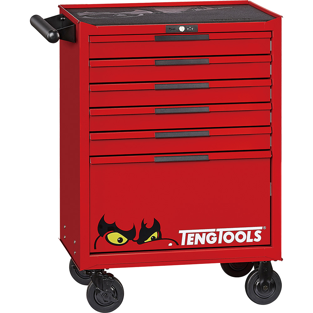 TSW26R6 | Teng Pro35 26in Roller Cabinet 6 Drawers Red Features The TengTools 26 PRO35 roller cabinet TSW26R6 with 6 drawers is a premium solution for mobile tool storage tailored for professional use. Measuring 680 mm in width 460 mm in depth and 813 mm in height (960 mm with castors) this roller cabinet is engineered to provide ample storage while maintaining a manageable footprint in various workspaces. This roller cabinet features six fully extendable drawers: five with a height of 75 mm and one larger drawer with a height of 312 mm. Each drawer is designed to hold any combination of TengTools modules with dimensions aligning with four TC1 modules plus a TCX4 module thus allowing for a highly organized and efficient tool arrangement. The drawer capacity is 40 kg for each drawer ensuring it can accommodate a wide range of tools and equipment. Enhancing its functionality each drawer is fitted with smooth running ball bearing slides providing reliable operation. The drawers are also equipped with EVA mats which protect tools reduce noise and maintain organization during movement. The top area of the cabinet features a 5 mm EVA top mat that makes for a stable and resilient work surface. Additionally the cabinet is equipped with accessory holes on both sides enabling further customization to meet specific professional needs. For ease of movement and stability the cabinet includes heavy-duty castors – two 5 braked swivel castors and two 5 fixed castors. A comfort grip handle on the side assists in maneuvering the cabinet around the workspace. Security is addressed with a 3-digit combination lock providing peace of mind by safeguarding the contents. With its 3-piece heavy gauge steel cabinet frame and 5-step phosphate-free rust prevention process this cabinet is built for durability. Six fully extendable drawers with 30-40 kg capacity compatible with TengTools Tool Control System for organized tool storage Drawers feature smooth running ball bearing slides and noise reducing EVA mats 5 mm EVA top mat provides a durable work surface Equipped with a 3-digit combination lock for secure storage 3-piece heavy gauge steel cabinet frame Treated with a phosphate free 5-step rust prevention process and powder coat finish Specifications Number of drawer: 6 Drawer capacity: 6x 40kg Drawer size(s) 5x – 380 x 75 x 575mm 1x – 380 x 154 x 575mm Width: 680mm Depth: 460mm Height: 656mm Height with casters: 960mm Caster size: 5in x 1-1/4in Net weight: 54kg