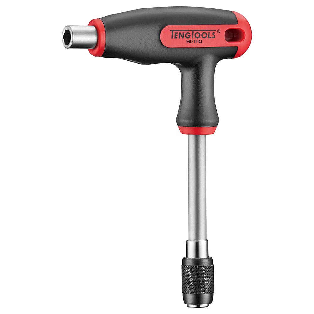 MDTHQ – T-Handle Quick Chuck For 1/4 hexagon bits and 1/4 drive sockets. Quick chuck for quick and easy bit changing. 1/4 hexagon bits drive with recessed magnet on the short end that holds the bit as well as the fastening (ferrous materials only). Ergonomically designed bi-material handle. Blade Length: 12mm / 75mm Overall Length: 87mm / 130mm Weight: 104g Drive: 1/4 Hex