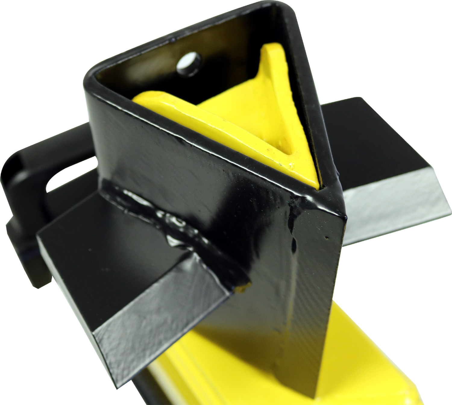 Sturdy cross wedge for legendary 5 ton log splitter LS5. The photograph shows the cross wedge in place fitted to the log splitter in yellow.