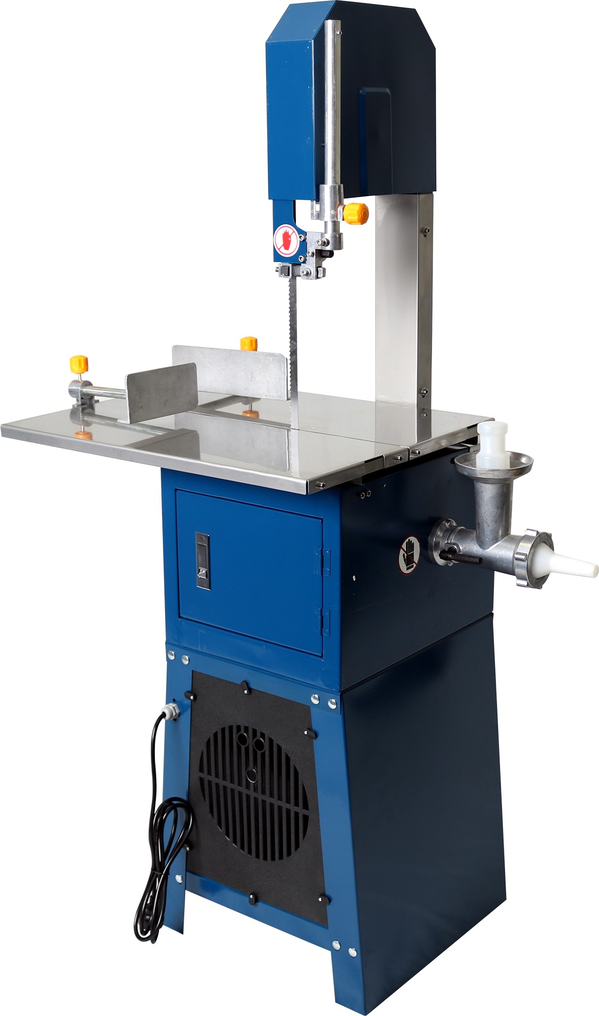 Meat cutting bandsaw with mincer and stand.