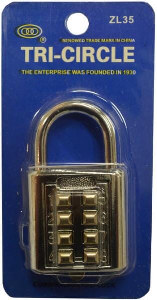Push button combination padlock set on a preset random combination, 8 button, 35mm chrome plated body, great for use when you don””t want the hassle of carrying a key.