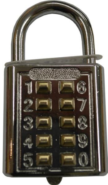 Push button combination padlock set on a preset random combination, 10 button, 35mm chrome plated body, great for use when you don””t want the hassle of carrying a key.