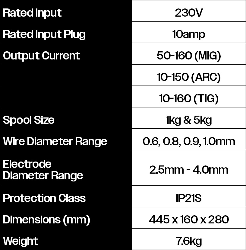 Designed with the home welder in mind, delivering exceptional versatility and user-friendly performance. Whether you’re tackling ARC, MIG or TIG welding, all on a 10 amp plug.
