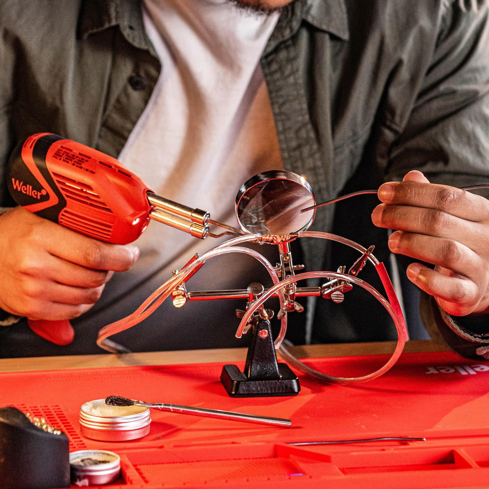 Free up your hands for improved soldering precision and flexibility with Weller’s Helping Hands with Magnifier. Easily position components with 4-way swivel alligator clamps and magnify your work area 4X larger for expert soldering.